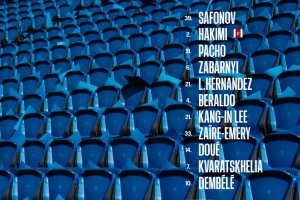 39-萨福诺夫、2-阿什拉夫、51-帕乔、6-扎巴尔尼、21-卢卡斯、4-贝拉尔多、21-李刚仁、33-扎伊尔·埃梅里、14-杜埃、7-克瓦拉茨赫利亚、10-登贝莱