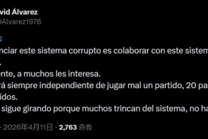 体育资讯4月11日讯 皇马TV主持人David Álvarez更新社媒,表达了对皇马1-1赫罗纳比赛中判罚的不满。